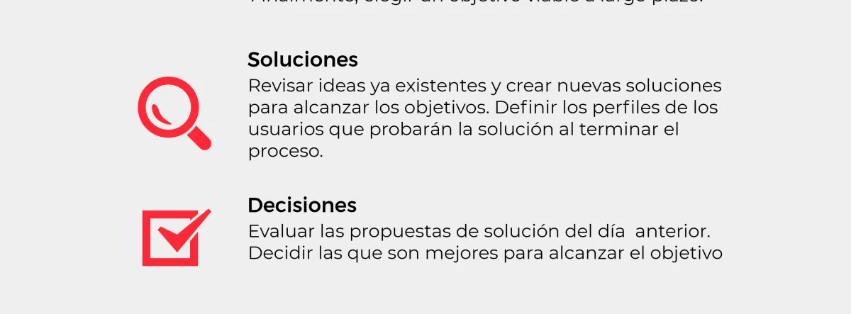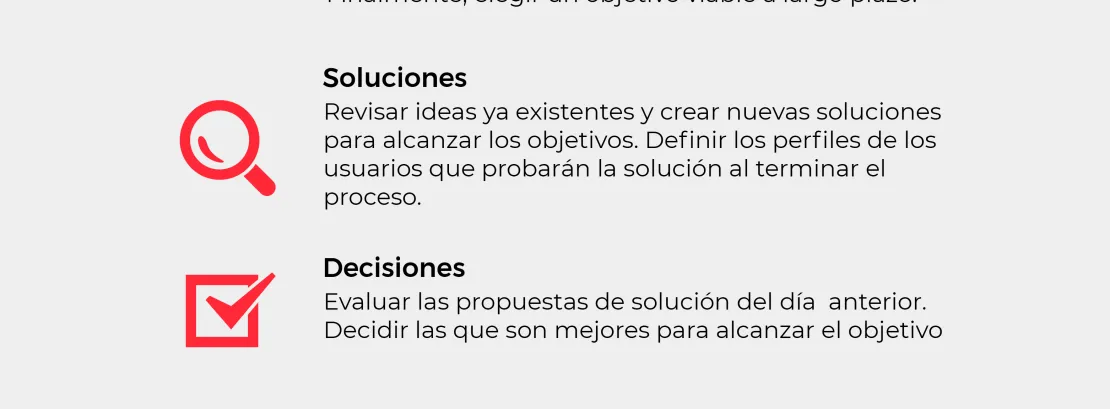 - Martes. Si tenemos objetivos, ya podemos buscar las primeras soluciones que no serán las definitivas. El siguiente paso es repartir tareas en el equipo y empezar a desarrollarlas.