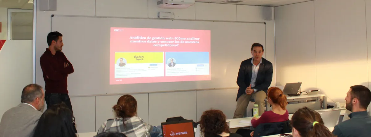 Para ello, han participado en este Programa Enfocados de EAE expertos en la analítica web como Jorge González Marcos, ecommerce y desarrollo de negocio en Philips además de docente en EAE, y Jorge García Gómez, fundador de la agencia de publicidad digital Marketing Paradise. “Ayudamos a empresas a crear estrategias digitales para generar negocio, queremos ayudaros a saber qué es lo más complicado, conocer qué hacen los demás desde el punto de vista de posicionamiento en Google” explica Jorge García. La sesión ha sido muy dinámica con la finalidad de aportar valor en áreas como ecommerce y marketing digital de la Escuela, especialidad del docente en la Escuela.
