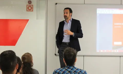 Carlos cierra la primera entrega de los talleres de empleabilidad organizados por el Departamento de Carreras Profesionales de EAE. “Voy a contaros las reglas del juego, el entorno que tenéis ahí fuera para que cuando os enfrentéis con el mercado laboral lo hagáis bien” explica a los estudiantes de EAE: “si salís al mercado preparados os va a ir bastante mejor” aclara.