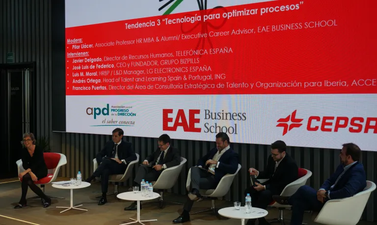 Tras un pequeño break donde el público, entre ellos alumnos de EAE Business School, aprovecharon para fortalecer su networking, la jornada continuó con la tercera tendencia. Esta estuvo moderada por Pilar Llácer, profesora del MBA de la Escuela, e intervinieron Javier Delgado, Director de Recursos Humanos de TELEFÓNICA ESPAÑA; José Luis de Federico, CEO y fundador del Grupo Bizpills; Luis M. Moral, HR Buisness Partner / Talent Management en LG Electronics; Andrés Ortega, Head of Talent and Learning Spain & Portugal de ING España & Portugal; y Francisco Puertas, Talent and Organization Lead de Accenture.
