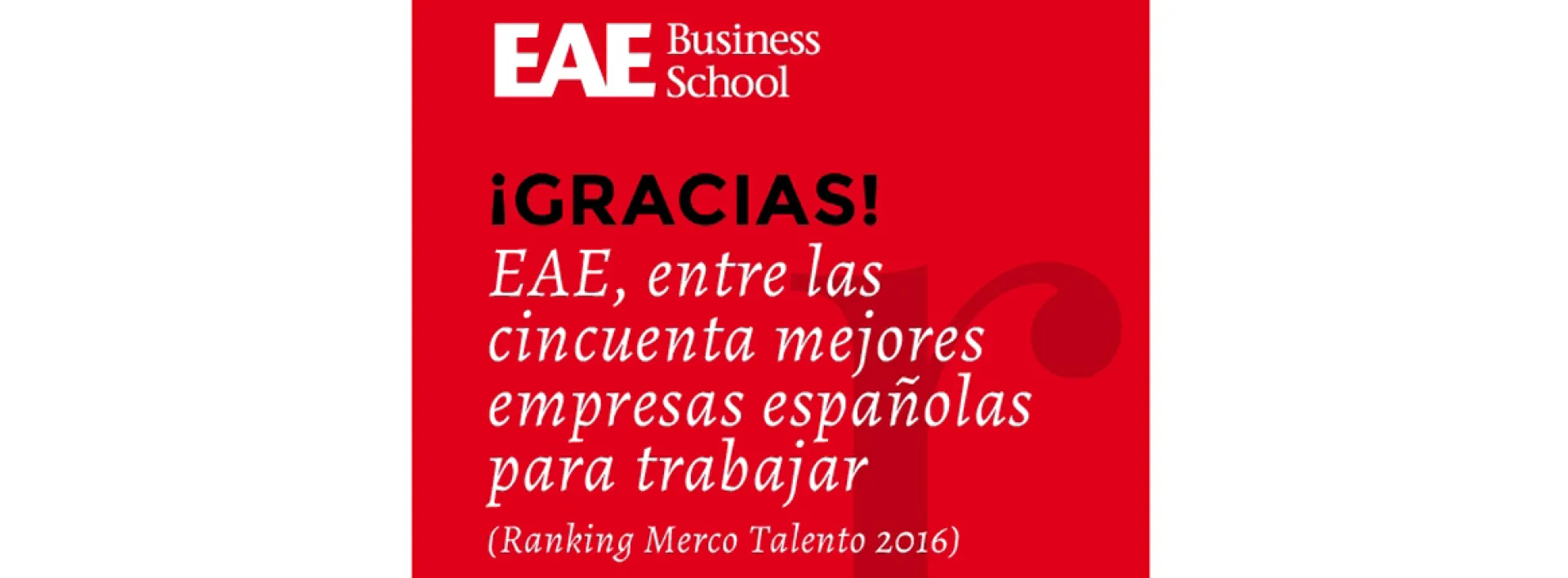 EAE Business School ha sido destacada de nuevo en el Ranking Merco Personas 2016, monitor que destaca a las cien mejores empresas españolas para trabajar y con mejores talentos. En esta edición, EAE asciende veintidós posiciones y se sitúa entre las 50 mejores empresas españolas para trabajar, en una clasificación general liderada por Inditex, Repsol y BBVA. Además, EAE asciende un puesto en el ranking de mejores Escuelas de Negocios para trabajar, y se coloca en tercera posición.