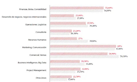 Los perfiles más demandados en el entorno laboral actual son el de Marketing y Comunicación (68%), Comercial y Ventas (58,90%) y, también, Finanzas y Administración (54,10%). Además, las perspectivas advierten de un aumento significativo en las posiciones relacionadas con gestión de proyectos, especialmente en lo relativo a la adaptación al escenario tecnológico actual (Big Data, redes sociales e Inteligencia Artificial) en una economía global, sostenible y circular.