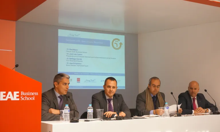 Facilitar el bienestar y el desarrollo pleno de las personas que forman parte de la organización y lograr la mejora de la calidad de vida de estas en la sociedad son los objetivos que forman parte de la misión de la Norma Sello de Horarios Racionales que proporciona la Asociación ARHOE. El pasado martes 21 de noviembre, el Salón de Actos del Campus de Madrid de EAE Business School acogió una jornada de Business Networking donde se trataron los beneficios de contar con este sello en una organización y cómo funciona el proceso para lograrlo.