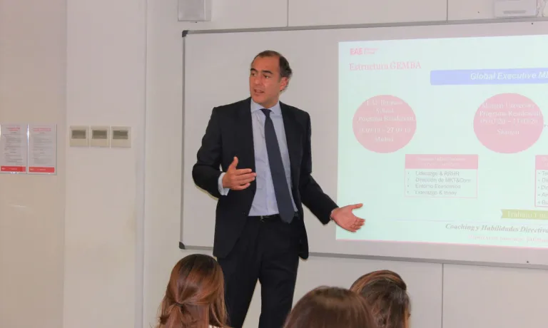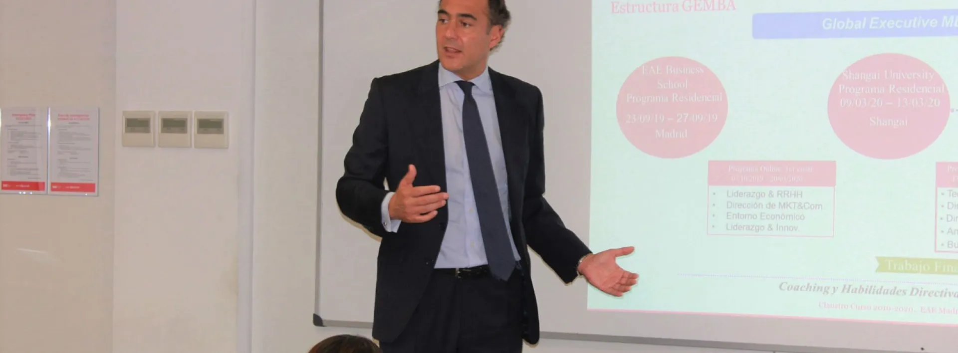 El GEMBA impartido en EAE Business School tiene lugar en tres localizaciones distintas: el campus de Madrid de EAE, la Universidad de Shanghai y la Kean University de New Jersey (Nueva York). La formación va dirigida a estudiantes con cierta trayectoria laboral, mínimo 10 años, y experiencia en puestos directivos. Para Ángel del Castillo el aprendizaje es bidireccional porque los docentes se instruyen también gracias a los alumnos: “el poder aprender de todos vosotros hace que estos másters funcionen realmente bien”. Para el director de programas existen dos objetivos fundamentales en estos residenciales, el primero de ellos es el networking y el segundo el coaching, que “os va a ayudar mucho a reflexionar” aclara.
