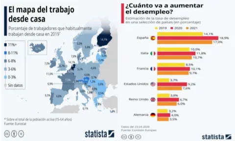 Tras COVID19, el porcentaje de desempleo en España va a ir vinculado al número de trabajadores que no puedan trabajar de forma remota. La pandemia ha extendido esta modalidad de trabajo a profesiones que nunca lo habían desempeñado, como profesores, técnicos, chef, cuidadores y a empleados que aunque lo habían podido hacer antes, por culpa de una cultura de presencialidad, no lo habían llevado a cabo.