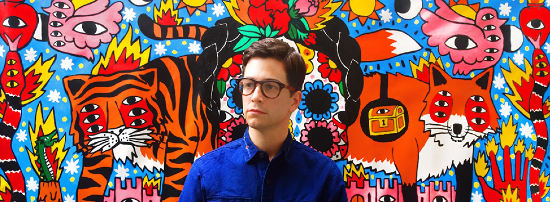 His creations are unmistakable. A burst of primary colours as the main protagonist in all of them. His most characteristic marks are the eyes and the fire, alongside with the tattoos —that tell the stories of the characters—, the noses and the blushed cheeks. The work of Ricardo Cavolo draws inspiration from daily life. A clear example of this is that we can find characters and heroes from our childhood having to deal with the ordinary things of our day to day.