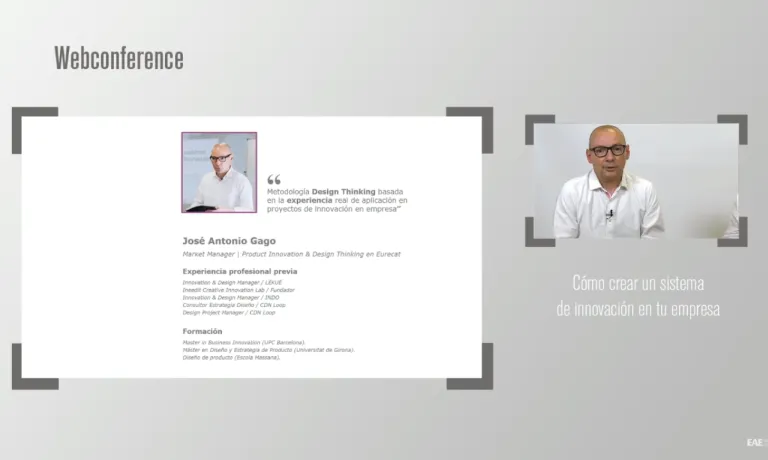 On 19th April, EAE Business School organized a web conference entitled "Creating an innovation system in your company". The aim was to explain the phases of innovation processes, the tools used and a few examples of success stories.